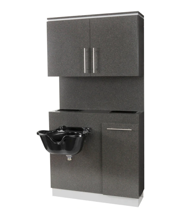 DescriptionThe Bali 1067 Shampoo Bulkhead w/ Storage is 100% Made in the U.S.A. at the Buy-Rite Cabinet Shop and is available in 20 popular laminates with any two-tone color combination. This shampoo unit is a stylish and practical as it ships to you with three fully assembled pieces that are easy to install against any wall in your salon. The lower portion of this beautiful shampoo cabinet features a large mounting area that will accommodate any shampoo bowl, a tilt-out soiled towel hamper (bin not included), and two built-in shampoo wells to store all of your frequently used products. The upper section of this shampoo unit features an 16" backsplash and two large storage cabinets with adjustable shelves. The Bali 1067 Shampoo Bulkhead w/ Storage also features upgraded brushed metal handles for style and durability. Please call our sales team at (800) 477-6655 for color and customizing options. **Shampoo Bowl Sold Separately**