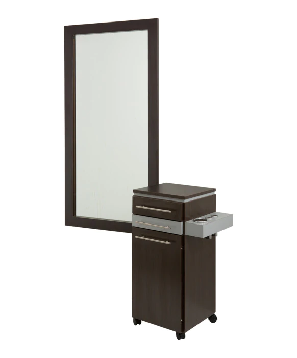 DescriptionThe Bali Portable Styling Station & Mirror package includes the popular Bali Portable Styling Station and the matching Iso Mirror for one great price. These items are both 100% Made in the U.S.A. to enhance its quality while also supporting local Americans who share our passion for American craftmanship. The Bali Portable Styling Station & Mirror Package is available in 20 popular laminates with any two-tone color combination. The Bali Portable Styling Station features an upper utility drawer, a compact scissor drawer, large storage cabinet with an adjustable shelf and side mounted customizable appliance holder. All of the drawers on this station are outfitted with full extension glides and luxurious 11" brushed metal handles. The matching Iso Mirror features a full length mirror and frame designed to perfectly match the Bali styling stations. Please call our sales team at (800) 477-6655 for color and customizing options.