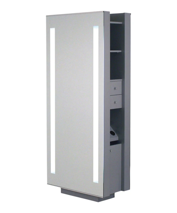 DescriptionThe Belvedere OP291-HPL Opal Double Sided Styling Station with full-length mirror and built-in lights is the perfect styling vanity. This double sided styling station features two full-length mirrors highlighted by ilumina florescent lamps that create the perfect the ambiance for clients. Built with a 4-plex outlet in lower side storage cabinet (on both sides) all of the electrical cords for the slide out appliance holders are completely hidden. Both sides of the Belvedere Opal styling station feature two open storage cubbies, two drawers with full extension slides and a slide out appliance holder. **Pictured in satin stainless**