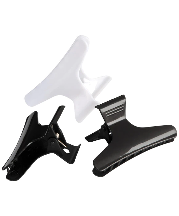 DescriptionGreat for keeping hair in place, sectioning hair while styling, or keeping hair off the face while applying makeup. Trendy, black and white, wide butterfly clamps are made of durable plastic, have easy grip handles, a tight spring, and firm rounded teeth to securely hold hair. 3" clips come in a pack of 36: 18 white and 18 black.
