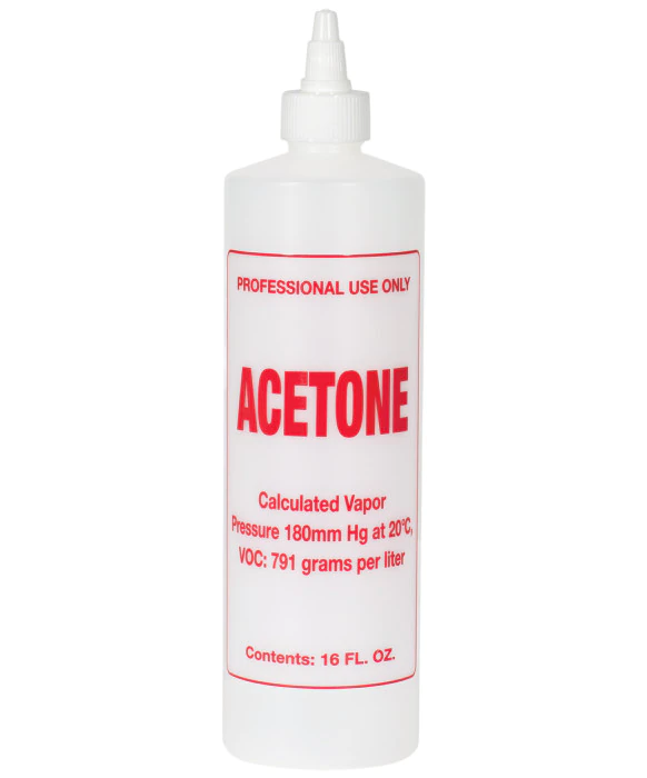 DescriptionStrong plastic bottle holds 16 oz. of liquid and is conveniently pre-labeled in bright red letters to easily identify the contents. Features a twist-top cap. Bottle is imprinted with "ACETONE" and holds 16 oz. Set of (6) bottles, solution not included.