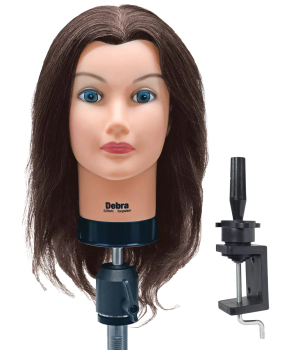 DescriptionRealistic mannequin has 100% human hair and is ideal for practicing any technique. Debra has brown, level 5 hair that is 17" - 19" in length and ready to be styled, colored, cut, curled, straightened, and more. The mannequin holder (H-888) has an adjustable clamp and can be securely attached to most surfaces. Sturdy, plastic ship wheel tightens and rotates the mannequin head to any angle for easy styling. -