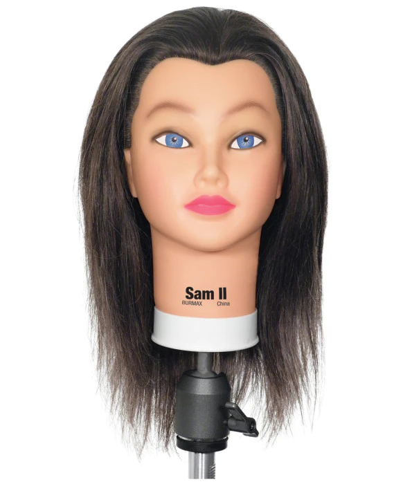 DescriptionA great option for stylists in training, realistic mannequin has a greater density of hair than typical manikins, offering more styling possibilities. Sam has attractive facial makeup and brown, level 5, 100% human hair that is 19"-22" in length. Ideal for practicing numerous cutting, coloring, curling, braiding, and styling techniques. Can be also used with blow dryers and hot tools. Fits comfortably on a tripod or secures tightly to any surface with a holder. -
