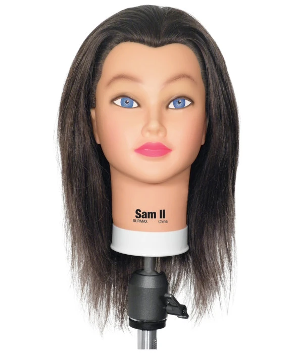 A great option for stylists in training, realistic mannequin has a greater density of hair than typical manikins, offering more styling possibilities. Sam has attractive facial makeup and brown, level 5, 100% human hair that is 19"-22" in length. Ideal for practicing numerous cutting, coloring, curling, braiding, and styling techniques. Can be also used with blow dryers and hot tools. Fits comfortably on a tripod or secures tightly to any surface with a holder.