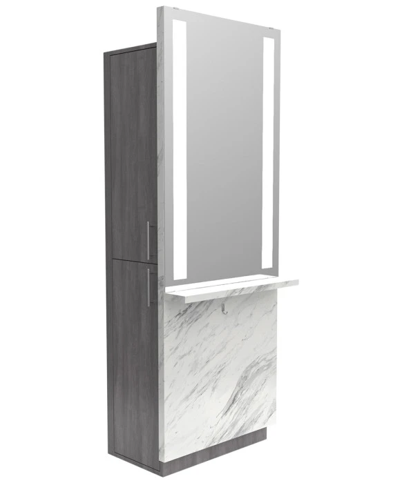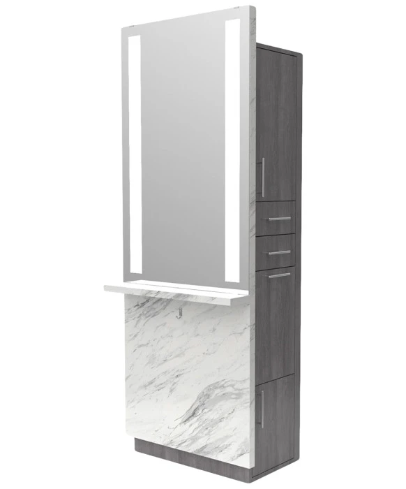 DescriptionThe Enclosed Formula Styling Station by Collins combines exceptional versatility with a sleek and sophisticated design. With its durable laminate finish and ample storage space, this striking styling station is both stylish and built to last. On the right side, a spacious upper cabinet with an adjustable shelf is paired with two full-extension drawers, a utility drawer equipped with a built-in tool holder and 6-outlet power strip, as well as a compact lower cabinet for additional storage. The built-in tool panel keeps styling essentials organized and ready to use and is available in either a tilt-out or pull-out drawer style. On the left side, you’ll find two large cabinets, each with two adjustable shelves—offering generous storage for everything from bulk supplies to personal items. Proudly made in the USA, the Enclosed Formula Styling Station is available in a wide range of color and hardware options, allowing you to create a look that perfectly complements your salon’s aesthetic. **Mirror Sold Separately**