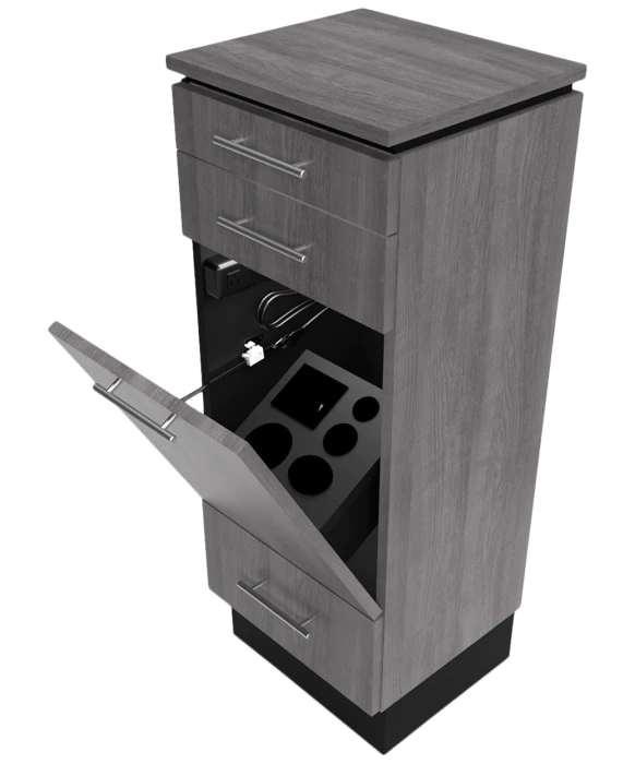 - (1) Tip-Out Tool Panel Equipped w/:- Blow Dryer Holder- Flat Iron Holder- 1" Curling Iron Holder- 2" Curling Iron Holder- Clipper Holder