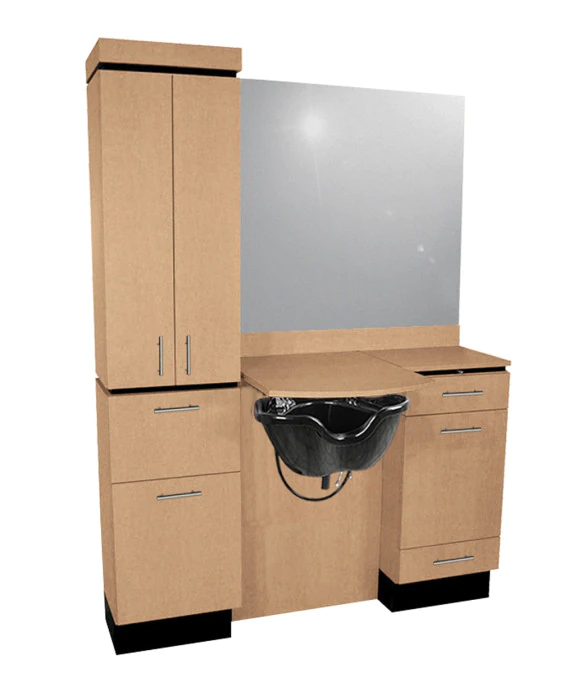 DescriptionThe Neo Superior Wet Booth Unit by Collins is made 100% in the USA, offering superior quality that is unmatched in the salon equipment industry. This salon essential comes with a fully-equipped tilt-out tool panel and a shampoo bulkhead with a built-in bottle well and radius-front lift-lid. The Neo also includes a wall-mounted 36” x 42” mirror, as well as a tower-style cabinet which features two adjustable shelves, tilt-out clean towel storage, and tilt-out soiled towel hamper! This wet booth also provides you with two pull-out drawers, a 3” high backsplash and contemporary bar pulls, and comes in your choice of more than 50 laminate colors. *Please allow additional lead time for shipment of special upcharge laminates.