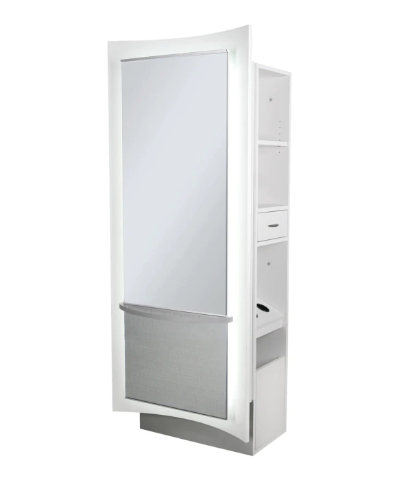 DescriptionThe Kurve Formula Styling Station by Collins is made 100% in the U.S.A. and as with all Collins' equipment, it is designed and built with top of the line quality and craftsmanship. This smart contemporary design will take your salon to the next level. The Kurve Styling Station is for ONE Stylist, featuring a drawer, easy-access pull-out tool panel, cord drop, and upper storage shelves. The unit includes top-to-bottom wire chase, duplex outlet, six-outlet power switch, LED lights and more! This unit is free-standing and mounted on a kurved pedestal base. We also have the Kurve Wall-Mounted Mirror, Kurve Wall-Mounted Full-Length Mirror, Kurve Back-to-Back Mirror Station, Kurve Back-to-Back Formula Styling Station and the Kurve Reception Desk to furnish your entire salon!