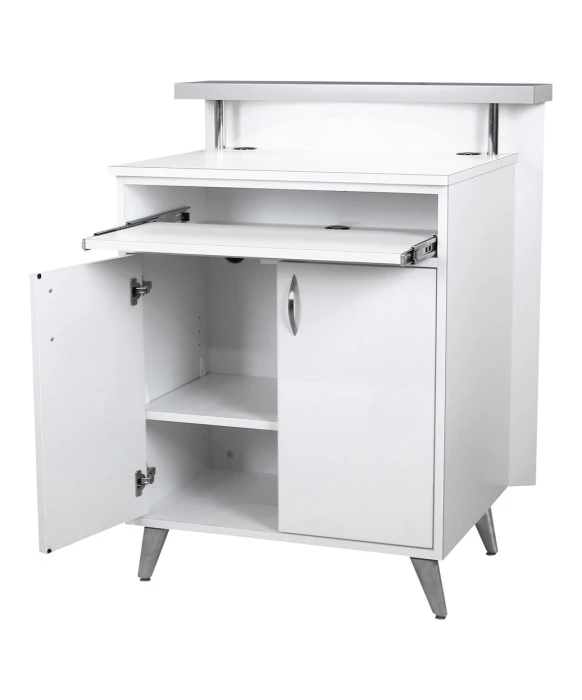 DescriptionThe Kurve Reception Desk by Collins is made 100% in the U.S.A, offering superior quality that is unmatched in the salon equipment industry. The contemporary design for the Kurve Reception Desk features an etched glass accent panel and tapered aluminum legs. The desk includes a pull-out keyboard tray and a lower storage cabinet with a shelf and two doors. We also have the Kurve Wall-Mounted Mirror, Kurve Wall-Mounted Full-Length Mirror, Kurve Back-to-Back Mirror Station, Kurve Formula Styling Station and the Kurve Back-to-Back Formula Styling Station to furnish your entire salon!