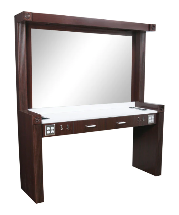 DescriptionThe Quinton Barber Station by Collins Manufacturing is a newly designed and cutting-edge barber station built with the highest level of quality in the industry. This professional barber station features a white solid surface counter-top, two drawers, two barbicide holders, two blow dryer holders, two clipper pockets, four clipper hooks, and two quad electrical outlets. The Quinton Barber Station is perfect because the barber can work from either or both sides of the chair. This station is very versatile in that it can also be used for two barber with one station. The Quinton Barber Station comes complete with the Quinton Soffitt with color-matched fluted molding & rosettes, T5 fluorescent lighting, light switch, wire-chase, installation panels, and a 36" x 60" mirror. In order to perfectly match the decor and style of your barber shop you can choose from 49 different laminate options! Pictured below with the Collins B70 Cobalt Omega Barber Chair (Sold Separately)