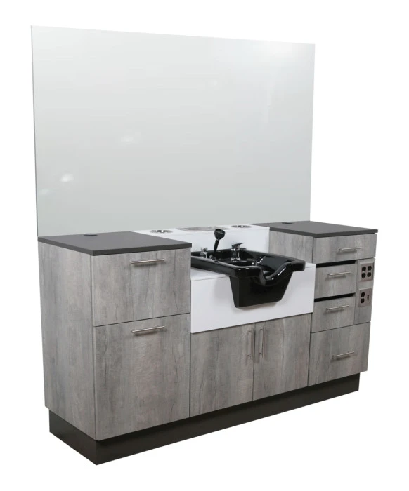 DescriptionThe Collins 68A LaCarte Barber Station is made 100% in the U.S.A. and is designed and built with functionality & durability at the forefront. The LaCarte 68A Barber Station features storage on either side with the shampoo bowl in the middle. The right side of this unit features the Collins 6813-20 Barber Cabinet that comes equipped with (2) Storage Drawers, (2) Clippers Drawers with UV Germicidal Lights, (3) Duplex Electrical Outlets, (1) Light Switch and a Wire Grommet. The left side of this unit features the Collins 6815-20 Towel Cabinet that come equipped with a Tilt-Out Door for Clean Towels, a Tilt-Out Door with Bin for Soiled Towels and a Wire Grommet. The middle portion of this unit features the Collins 6811-32 Anchor Cabinet with Bowl that comes equipped with a CB80 Porcelain Shampoo Bowl, a White Solid-Surface Counter, a Stainless Bottle Well, (2) Stainless Barricade Holders and (2) Plumbing Access Doors. This unit is shown with a 36” x 72” Mirror that is not included and ordered separately. The LaCarte 68a Barber Station comes in your choice of a variety of beautiful laminate finishes and a 1-year warranty.