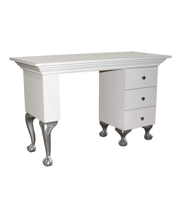 DescriptionThe Bradford Nail Table by Collins is made 100% in the USA, which guarantees exceptional quality that is unmatched in the salon industry. This elegantly designed nail table features beautifully crafted Claw & Ball legs and crown and dentil molding around the edges, and comes with a black desk lamp as well as three drawers for extra storage. The Bradford also provides your guests with the utmost comfort with a fully padded and upholstered armrest, and comes in your choice of 49 laminate colors!