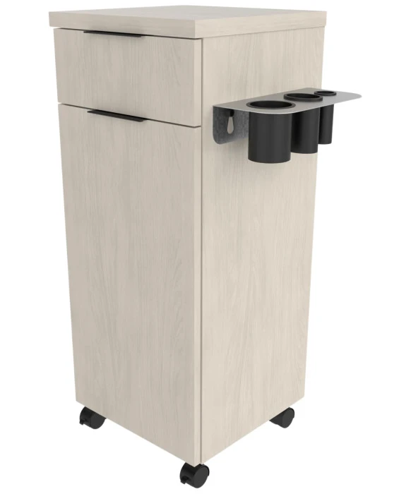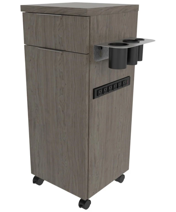 DescriptionThe Collins E1001 Finley Portable Styling Station is made 100% in the U.S.A. and represents a sleek mobile option to streamline your salon needs. The Finley Portable Styling Station sits atop (4) premium lockable casters with an option to add a six-outlet power strip for even more convenience when needed. The customizable Finley Portable Styling Station is a slim, low-profile unit that is available in a wide selection of popular laminates and comes with 3 color options for the drawer pulls (black, gold or silver). For easy and convenient setup, this stylish unit comes fully assembled and includes a stainless-steel tool panel, full extension drawer and a lower cabinet for additional storage. *Please allow 10 - 12 Weeks for shipment of special upcharge laminates.