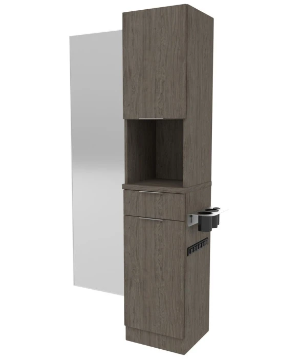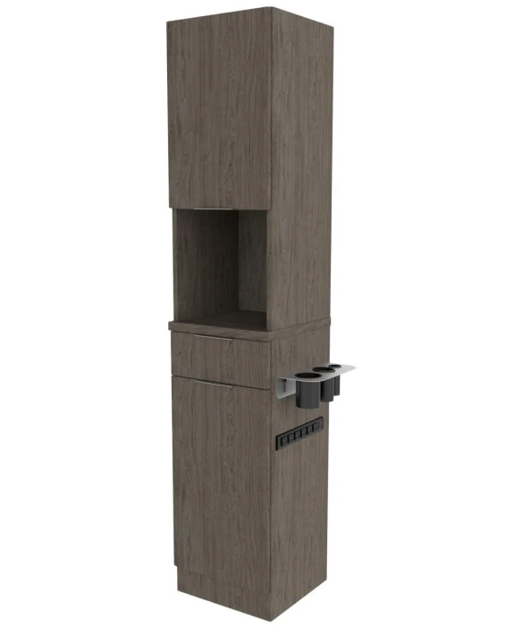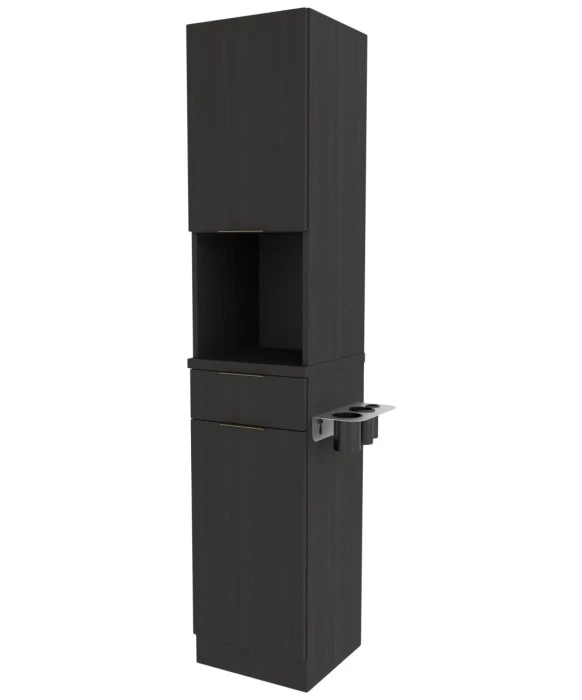DescriptionThe Collins E1021 Finley Tower Styling Station is made 100% in the U.S.A. and offers a functional and contemporary design that is a great complement to any salon space. The Finley Tower Styling Station is a slim and compact station that provides an option to add a built-in six-outlet power strip for added convenience. This styling station comes with spacious upper and lower storage cabinets, a full extension drawer, a stainless steel appliance arm and can be customized in over 50 laminates and 3 metal drawer pull color options. The Finley Tower Station provides the perfect amount of storage as well as an open workspace in the midsection that can also be used to showcase products. This sophisticated styling station will add functionality and modern elegance to any salon or barbershop. *Please allow 10 - 12 Weeks for shipment of special upcharge laminates.