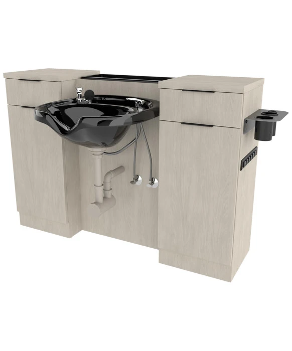 DescriptionThe Collins E1061 Finley Wide Wet Station is made 100% in the U.S.A. which guarantees exceptional quality that is unmatched in the salon industry. This stylish and sleek unit with its clean lines offers lower storage on both sides with adjustable shelves, top access molded bottle wells, two full extension drawers, and a stainless steel tool panel to keep tools within reach and organized. For easy customization, this unit is available in a wide selection of popular laminate colors, 3 color options for metal drawer pulls and 2 color options for bowl (bowl sold separately) and an optional six-outlet power strip. This wide wet station provides a larger workspace area, plenty of storage space and will add a touch of modern style to any salon or barber shop – call your Buy-Rite representative today and order yours! *Please allow 10 - 12 Weeks for shipment of special upcharge laminates. **Shampoo Bowl ordered separately