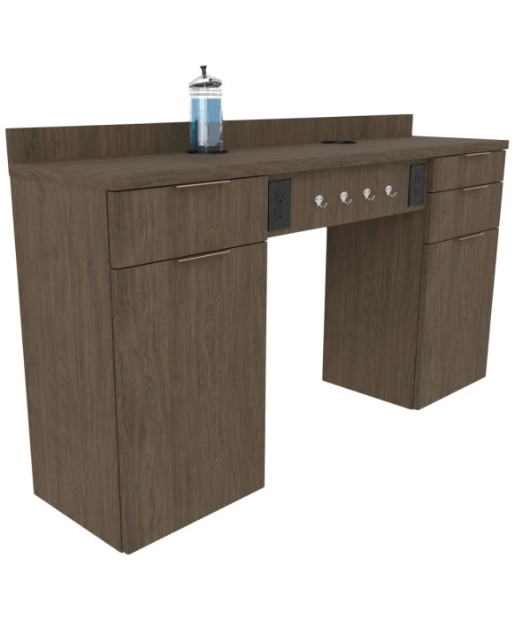 DescriptionThe Collins E1072 Aspen Barber Station is made 100% in the U.S.A. by using quality materials and fine craftsmanship ensuring years of stylish durability. This modern, wall-mounted barber station opens up your floor space while keeping all your styling and barber tools close. Available in a wide selection of popular laminates, you can choose from three color options for the metal cabinet pulls to customize the station to your decor. Featuring four clipper hooks, three full extension drawers, a full extension barber tool panel drawer, lower cabinet storage w/ adjustable shelf, two front-facing duplex outlets, two barbicide container holders and a six-outlet power strip this Aspen Barber Station is ideal for all of your barbering needs. **Please allow 10-12 weeks for shipment of special upcharge laminates.
