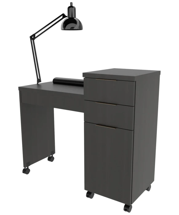 DescriptionThe Collins E1153 Essential Tall Nail Table w/ Two Drawers is made 100% in the U.S.A. Designed to offer more storage and a convenient multi-level workspace this sturdy unit sits atop (6) locking casters for effortless mobility within the salon. Helping to keep all your salon supplies organized, the unit has two extending drawers, one storage cabinet, one black lamp, and one black padded arm rest for client comfort. Available in a wide selection of popular laminate choices, 3 color options for the metal drawer pulls and an option to vent for HVAC. *Please allow 10 - 12 Weeks for shipment of special upcharge laminates.