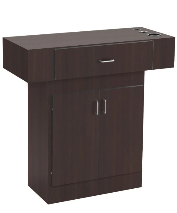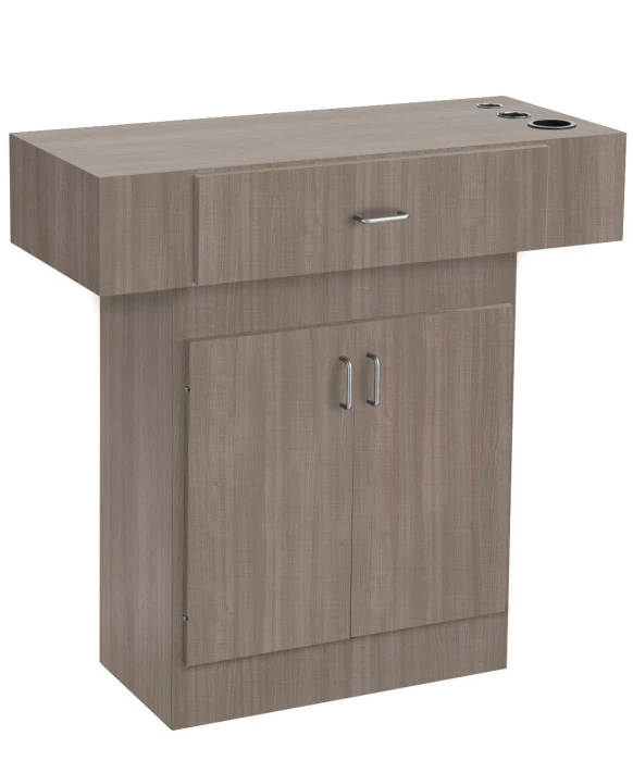 DescriptionThe Econo Styling Station with Storage is a free-standing salon styling station that is available in 20 popular laminate colors. This station is Made 100% in the U.S.A. of all-wood to enhance its quality while also supporting local Americans who share our passion for American craftsmanship - it's a perfect fit for any stylist or barber. The Econo Styling Station w/ Storage features a wide easy to clean work surface, a large storage cabinet with an adjustable shelf and a drawer for all of your tools. Both the top and bottom components are shipped fully assembled. For your convenience, you have the option to add customizable appliance holders to this styling station as pictured. *Please allow 6 - 8 weeks for shipment of colors other than black.