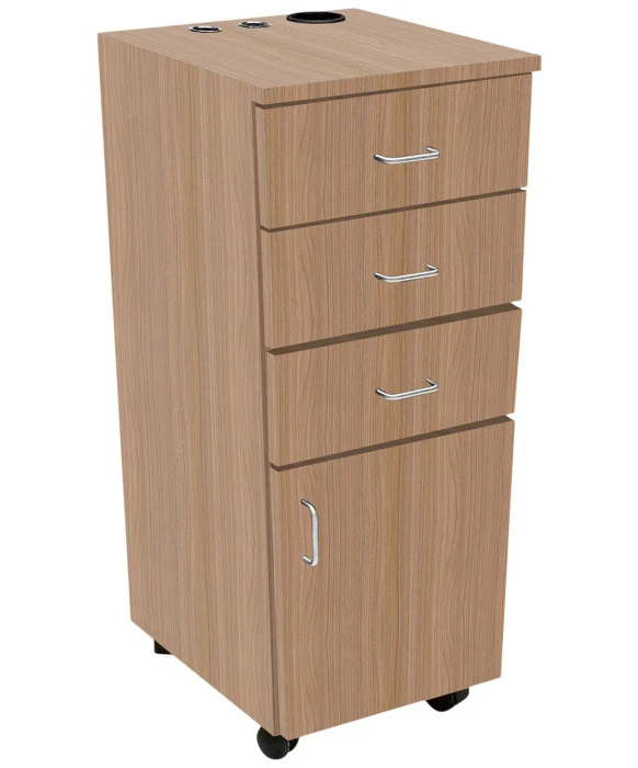 DescriptionThe Huntington Portable Styling Station is Made 100% in the USA of all-wood and is very stylish and durable. This station comes to you FULLY ASSEMBLED and is available in 20 different laminate colors. It features 3 wide storage drawers, 1 large storage cabinet and a large top work surface. This station's tapered design is very eye-catching and will blend perfectly with any salon decor. For you convenience, you have the option to add customizable appliance holders to this styling station as pictured.