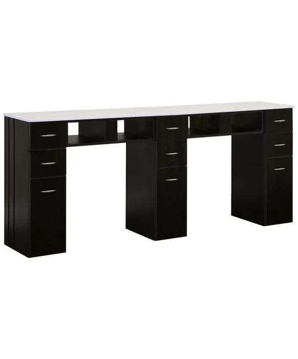 DescriptionThe J&A Double White Granite Top Nail Table is both sleek and modern making it the perfect workstation for any busy spa or salon. This double nail table is as comfortable as it is functional, with a rich walnut finish and a white, minimalist granite top. The J&A Double White Granite Top Manicure Table is perfectly sized to accommodate two nail technicians, the compact design means you can save space, and the white granite top is extremely easy to clean. This double nail table is easy to assemble and it comes on 12 strong casters conveniently hidden for easy mobility throughout your spa or salon. There is plenty of space for all your tools, with two UV dryer slots, a pre-drilled hole so you can install your own nail table light, six functional drawers to store your larger bottles, and a specialized trash compartment, there's room for everything. The J&A Double White Granite Top Nail Table is functional & comfortable, and is the best table to help you get the most out of your space! *Optional Air Ventilation System available by request, please call your Buy-Rite Salon consultant today for more details!