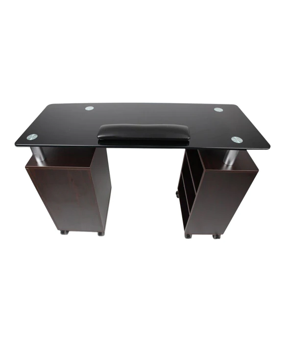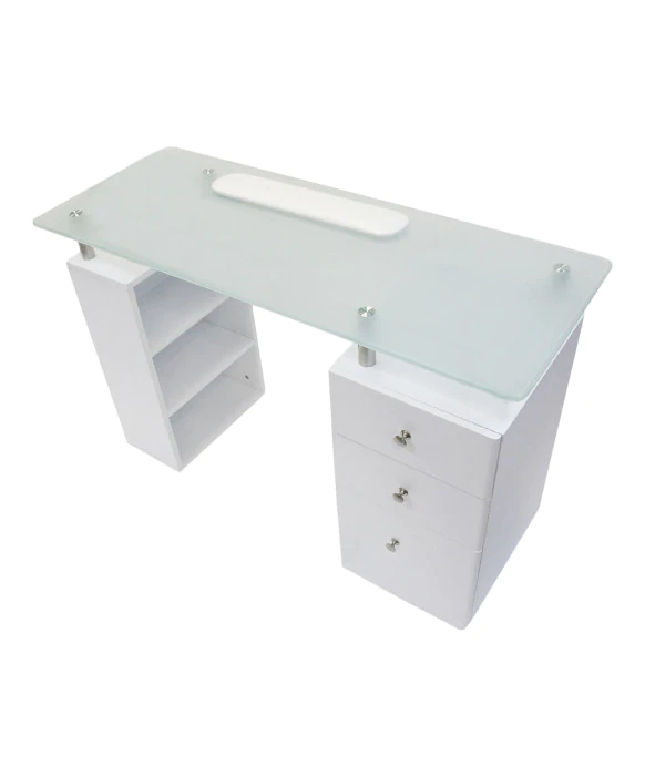 DescriptionThe J&A Glass Top Nail Table sets the stage for any contemporary chic setting. The glass top accentuates the rich wood finish offering the best value in its class. Choose from a white or walnut wood finish for your manicure table. This exquisite table features a frosted glass top with rounded edges, 3 drawers, and 3 open cabinets with additional storage capabilities. The well thought out design of this manicure table allows for maximum storage without taking away any aesthetics. This nail table also sits atop eight durable casters which allow for easy movement around your salon or spa for use as a mobile manicure table. The J&A Glass Top Nail Table also offers great design continuity with the matching Glass Top Accessory Pedi Cart and Reception Table. This popular nail table is also available with a draft vent or a marble top as additional options.