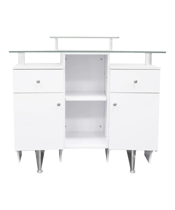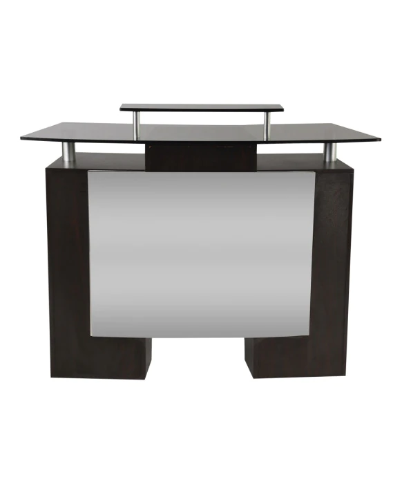 DescriptionThe J&A Glass Top Reception Desk is the perfect welcoming piece to any salon or spa. The glass top accentuates the rich wood finish offering best value in its class. The Decorative Front Metal Mirror Panel makes this piece unique and gives it a sleek, clean look. The J&A Glass Top Reception Desk also offers great design continuity with the matching Glass Top Nail Table and Accessory Pedi Cart.