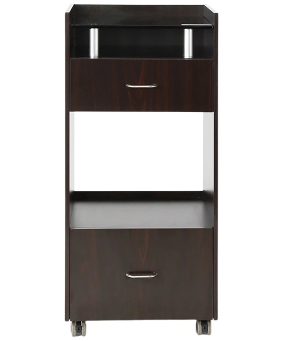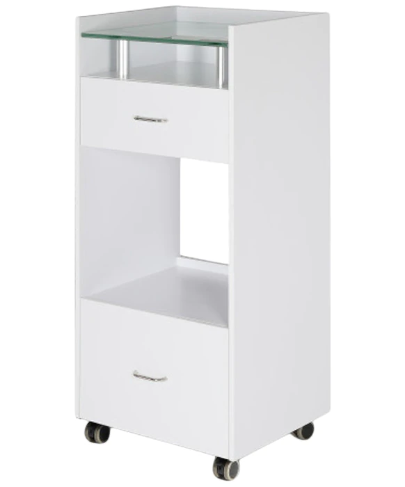 DescriptionThe J&A Glass Top Spa Trolley is great for estheticians and make-up artists alike, and it will add organization and functionality to your spa or salon with its clean and contemporary design. This compact skin care trolley is available in walnut brown wood with a smoked glass top, or white wood with a frosted glass top. It also features two convenient storage drawers with ample space for you tools and supplies, as well as an open storage area that is versatile and perfect for a hot towel cabinet. This spa trolley sits on four durable casters allowing for easy mobility throughout your spa or salon. The J&A Glass Top Spa Trolley helps keep tools and supplies organized and easily accessible for your staff, while adding a bit of modern flair to your salon or spa.