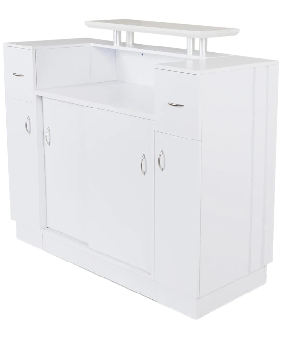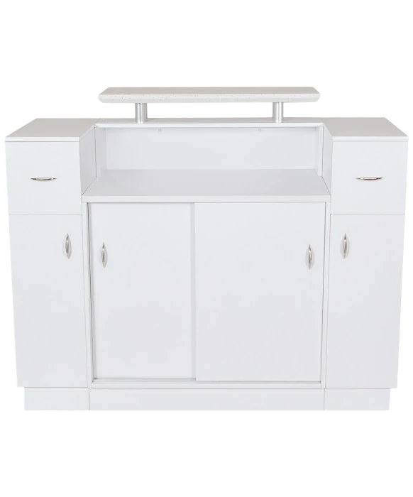DescriptionThe Granite Top Reception Desk by J&A is the perfect blend of style and function. A smooth wood finish is available in 2 different color options, both of which pair with the white granite countertop to give this desk a timeless and sophisticated look. The two back cabinets and drawers as well as the the front display area with 2 glass shelves make this desk as functional as it is gorgeous. Upgrade your reception area to one of modern sophistication with the Granite Top Reception Desk by J&A!
