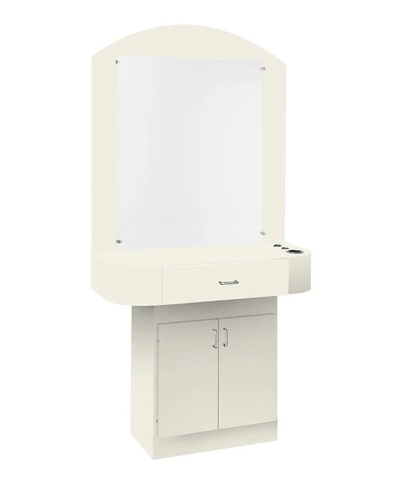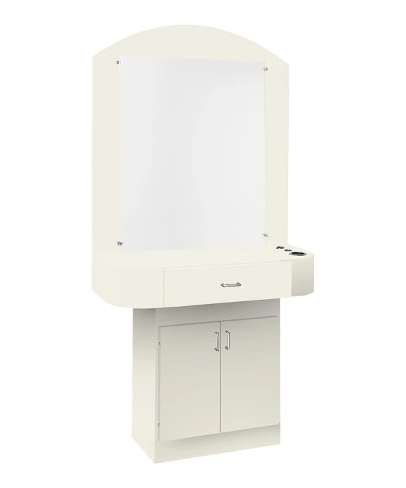 DescriptionThe Jazz Styling Station with Mirror and Backboard is Made 100% in the U.S.A. at our cabinet shop in Atlanta, GA and is available in 20 popular laminates. This free-standing salon styling station comes complete with a wood backboard and 30" X 36" mirror. The Jazz Styling Station features a 40" wide easy to clean work surface, a top utility drawer for all of your tools and a large storage cabinet with an adjustable shelf. For your convenience, you have the option to add customizable appliance holders to this styling station as pictures. Please call (800) 477-6655 to inquire about custom sizes and an optional lock.