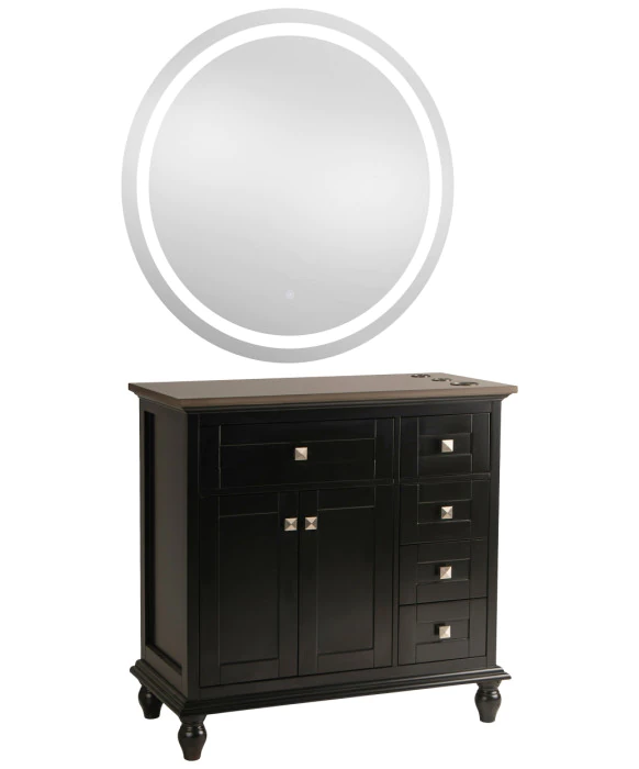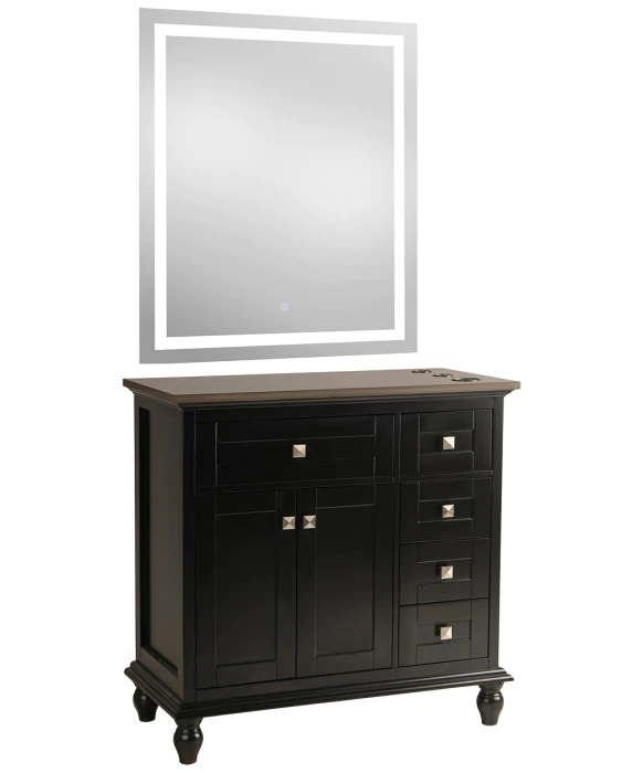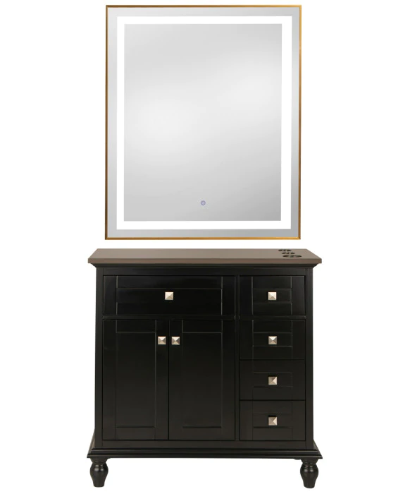 DescriptionThe Madison 36" Vanity Styling Station & Mirror is built from solid wood with great quality and attention to detail in mind. As pictured, the Madison 36" Black vanity features a beautiful Black finish and an Espresso Quartz top work surface. In addition to its large centered main drawer and cabinet, this vanity station features four full-extension drawers that line the right-hand side of the station to provide for ample storage for every stylists daily needs. This vanity station also features upgraded hardware with DTC soft closing door hinges and drawer slides to prevent unwanted clatter. The Madison station comes standard with a solid wood black frame mirror but can be upgraded to a modern LED mirror as well. The spacious quartz counter-top features built in appliance holders for your tools and it is easy to clean and maintain. The station’s open underside provides a clean look, while also allowing for easy cleanup. The Madison 36" Vanity station ships fully assembled is ready to go with a hassle-free set up.