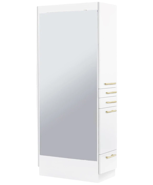 DescriptionThe Maxim Gold Styling Station is 100% Made in the U.S.A. and is built with the utmost craftsmanship found in the salon equipment industry. This free-standing salon styling station ships to you fully assembled and comes complete with a 60" full-length mirror and beautiful brushed brass metal bar pulls. The right side of the Maxim Styling Station features an upper storage cabinet, two utility drawers, a storage cabinet with a slide-out tool panel to accommodate one blow dryer and two curling irons, as well as an extra lower drawer for additional storage! The left side of the station offers even more storage space with two large cabinets. This station is designed with style and functionality in mind and is a perfect fit for todays popular mid-century modern design motif. The Maxim Styling Station is available in your choice of 40 laminate colors, so ask your Buy-Rite Beauty Sales representative today! *Please allow 6 - 8 Weeks for shipment of colors other than Black & White.