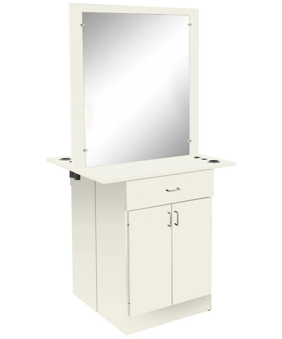 DescriptionThe Miami Double-Sided Styling Station is Made 100% in the U.S.A. at the Buy-Rite Cabinet Shop and is available in 40 popular laminates. This free standing styling station is designed to accommodate two stylists' needs in a limited work space. Each side of the Miami Double-Sided styling station features a 30" x 36" mirror, a 24" utility drawer and a large storage cabinet with an adjustable shelf. For your convenience, you have the option to add customizable appliance holders to this styling station as pictured. Please call (800) 477-6655 to inquire about custom sizes and an optional lock. *Please allow 6 - 8 Weeks for shipment of colors other than black.