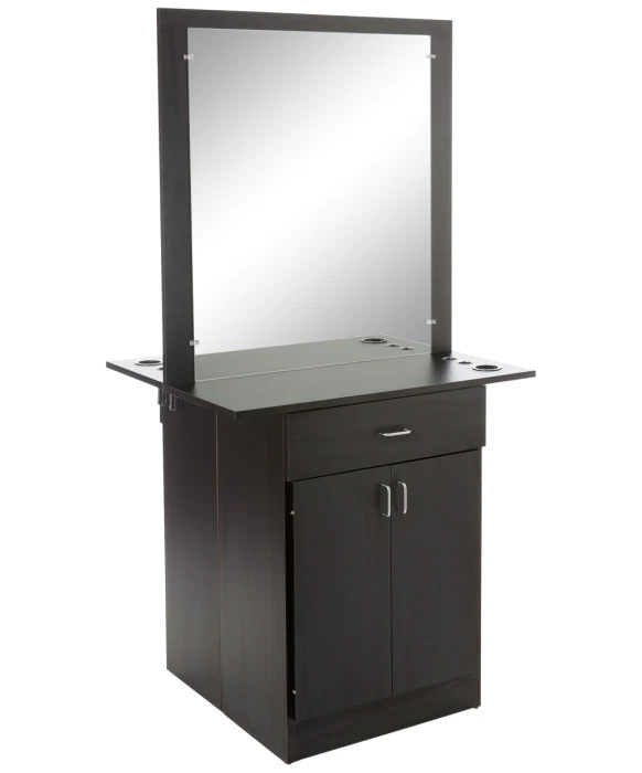 DescriptionThe Miami Double-Sided Styling Station is Made 100% in the U.S.A. at the Buy-Rite Cabinet Shop and is available in 40 popular laminates. This free standing styling station is designed to accommodate two stylists' needs in a limited work space. Each side of the Miami Double-Sided styling station features a 30" x 36" mirror, a 24" utility drawer and a large storage cabinet with an adjustable shelf. For your convenience, you have the option to add customizable appliance holders to this styling station as pictured. Please call (800) 477-6655 to inquire about custom sizes and an optional lock. *Please allow 6 - 8 Weeks for shipment of colors other than black.