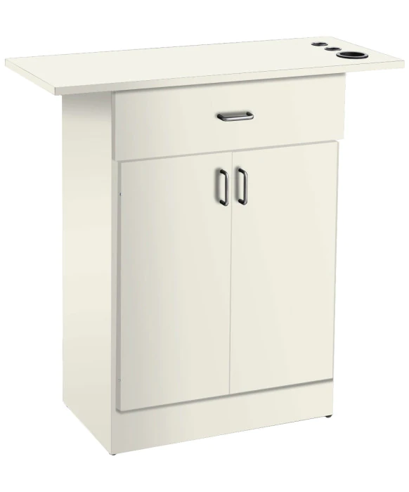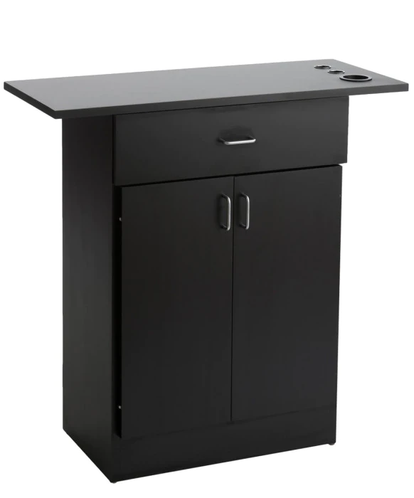 DescriptionThe Miami Styling Station w/ Storage is a free-standing salon styling station that is available in 40 popular laminate colors. This styling station is 100% Made in the USA of all-wood and perfect for any stylist or barber. The Miami Styling Station features a wide easy to clean work surface, a large storage cabinet with an adjustable shelf and a drawer for all of your tools. The two cabinets and storage drawer come equipped with a full metal handle making them easy to open and close. For you convenience, you have the option to add customizable appliance holders to this styling station as pictured. *Please allow 6 - 8 Weeks for shipment of colors other than black.