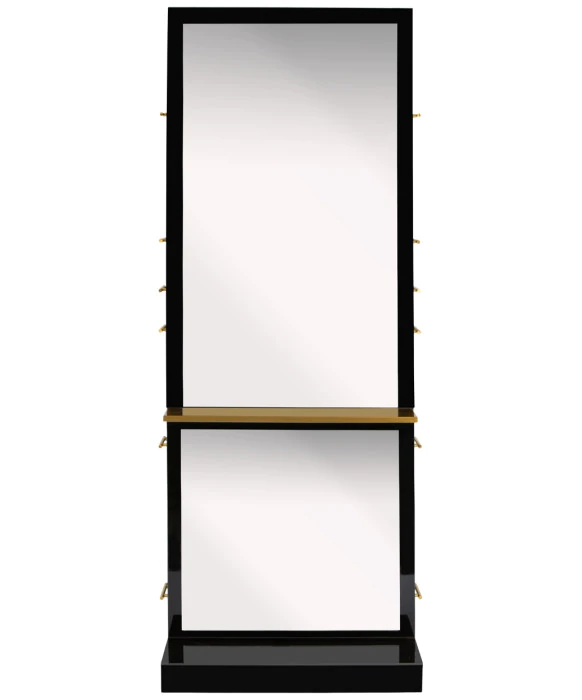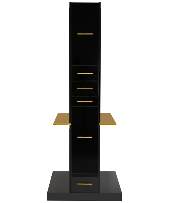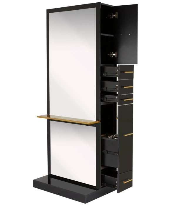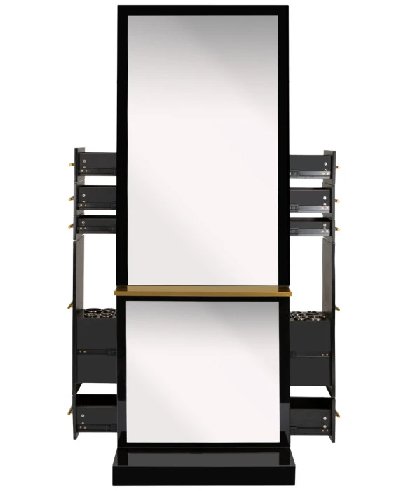 DescriptionThe Milan Double-Sided Styling Station with Shelf by Buy-Rite Beauty will elevate your salon with clean, modern lines and enough storage for two stylists. With organization and storage at the forefront of this design, this double-sided station features a large cabinet with adjustable shelf at the top, two standard storage drawers, one scissor drawer, a pull-out tool appliance drawer, and a spacious bottom drawer on each side. This styling station also features a full-length metal shelf and mirrors on each side. The Milan Double-Sided Styling Station comes in either a black gloss or white gloss finish, and the accent shelf and handles come in either gold, silver, or black to fit seamlessly into any aesthetic. Some additional features include hidden wheels on the bottom for easy maneuverability throughout the space and pre-cut outlet holes on both sides to easily run electrical wiring through the interior of the station. This styling station is the perfect addition for salons who are looking for a beautiful and modern design that offers ample storage. Check out our Milan Single-Sided Styling Station if you love the design of this station but are looking for the single version.