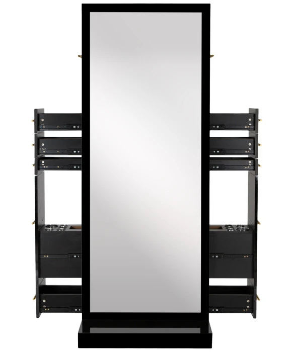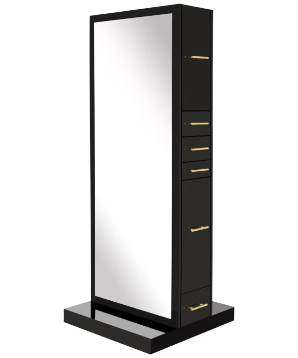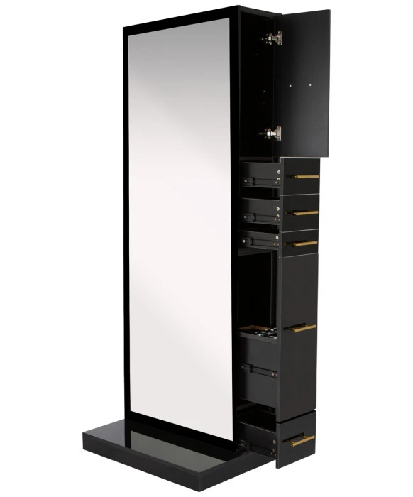 DescriptionThe Modena Double Sided Styling Station by Buy-Right Beauty is an all-in-one station offering stunning modern design and unmatched functionality. This styling station is designed to service two stylists at once featuring a full-length mirror, cabinet with adjustable shelf, four storage drawers and a slide out appliance drawer with metal tool holders on each side. The Modena Station comes in either a gloss black or gloss white finish and 3 handle color options; gold, silver, or black to fit your aesthetic vision. This double styling station is great for space saving at 30" wide and it has hidden wheels on the bottom for easy maneuverability throughout your salon. Additionality, this station is electrical ready with a pre-cut hole in the appliance drawers to keep your wires out of sight and ready to easily run electrical wiring through the interior of the station. The Modena Double-Sided Styling Station is ideal for those looking for a top-quality styling station with a stunning modern design. If you are looking for the single configuration of this styling station, check out our Modena Single-Sided Styling Station.