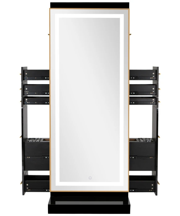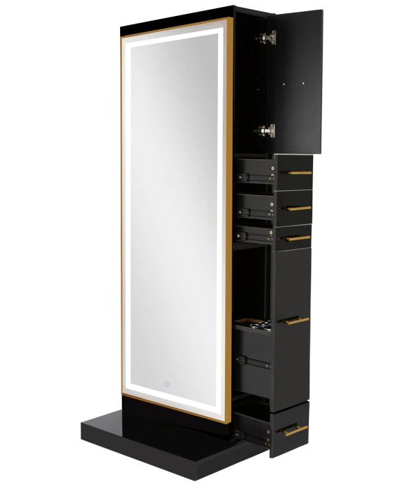 DescriptionThe Modena Ultra Double Sided LED Styling Station by Buy-Rite Beauty is an all-in-one station offering stunning modern design and unmatched functionality. This styling station is designed to service two stylists at once featuring a full-length LED mirror, cabinet with adjustable shelf, four storage drawers and a slide out appliance drawer with metal tool holders on each side. The Modena Ultra Station comes with multiple LED mirror options and is avaialble in either a gloss black or gloss white finish and 3 handle color options; gold, silver, or black to fit your aesthetic vision. This double styling station is great for space saving at 30" wide and it has hidden wheels on the bottom for easy maneuverability throughout your salon. Additionality, this station is electrical ready with a pre-cut hole in the appliance drawers to keep your wires out of sight and ready to easily run electrical wiring through the interior of the station. The Modena Ultra Double-Sided Styling Station is ideal for those looking for a top-quality styling station with a stunning modern design. If you are looking for the single configuration of this styling station, check out our Modena Ultra Single-Sided Styling Station.