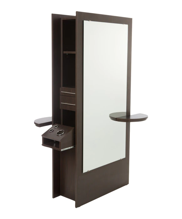 DescriptionThe Nobu Double Sided Styling Station is 100% Made in the U.S.A. and is available in 20 popular laminates. This free standing salon styling station is designed to accommodate all of the needs of two stylists in a limited work space. The front sections of the Nobu Double Station feature a quick-access utility shelf and a 60" full-length mirror to offer a luxurious modern touch to any salon. Each side of this styling station is equipped with an upper scissor drawer, a utility drawer, a storage cabinet with an adjustable shelf and a slide-out tool panel to accommodate one blow dryer and two curling irons. With style and functionality in mind, the Nobu Double Styling Station is outfitted with full extension glides and brushed metal handles. Please call our sales team at (800) 477-6655 for color and customizing options.