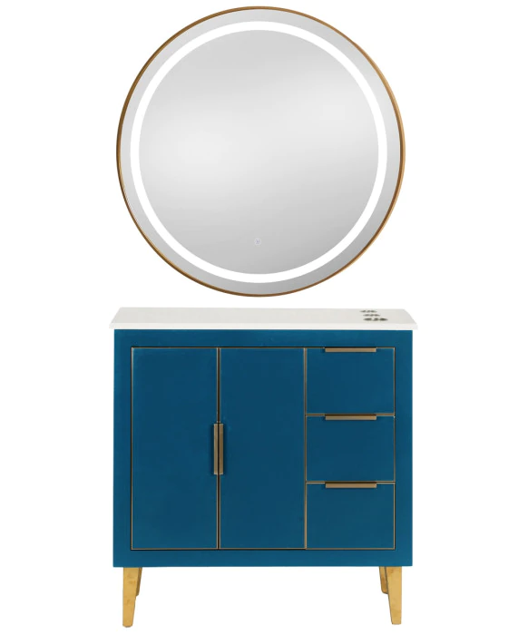 DescriptionThe Omega 36” Vanity Styling Station & Mirror is built from solid wood and features high-end craftsmanship with close attention to intricate details to be appreciated by stylists and customers alike. The Omega Vanity Station will add sophisticated elegance and a modern feel to any salon, spa or barbershop, and provides a clean, spacious work area for your stylists. This styling station features one large storage cabinet on the left side, and three full-extension drawers on the right side providing ample storage space. All drawers and cabinets are accompanied by soft-close bumpers and extensions to prevent unwanted noise in your salon, enhancing your client’s relaxing experience. The elegant quartz countertop is easy to clean and comes complete with 3 built-in appliance holders for your tools. The vanity cabinet sits on sturdy, brushed brass metal legs for support, and thus creates an open underside to allow for easy and fast cleanup. The Omega Vanity styling station comes complete with a matching wood frame mirror or it can be upgraded with your choice of (4) modern LED mirrors that work perfectly with this styling station. This station is also available in a Black, White, and Blue finish to perfectly match your salon's style and décor.