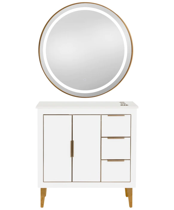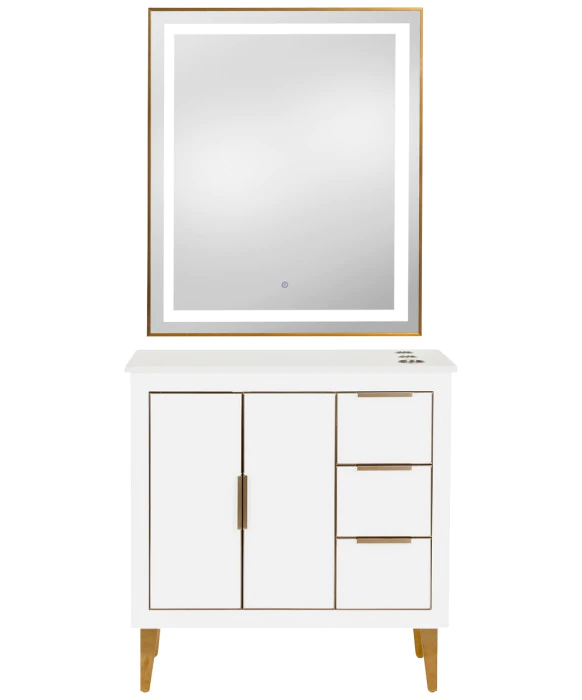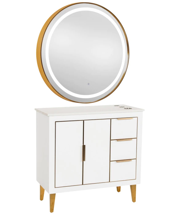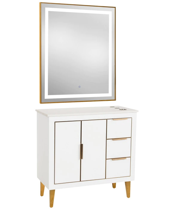 DescriptionThe Omega 36” Vanity Styling Station & Mirror is built from solid wood and features high-end craftsmanship with close attention to intricate details to be appreciated by stylists and customers alike. The Omega Vanity Station will add sophisticated elegance and a modern feel to any salon, spa or barbershop, and provides a clean, spacious work area for your stylists. This styling station features one large storage cabinet on the left side, and three full-extension drawers on the right side providing ample storage space. All drawers and cabinets are accompanied by soft-close bumpers and extensions to prevent unwanted noise in your salon, enhancing your client’s relaxing experience. The elegant quartz countertop is easy to clean and comes complete with 3 built-in appliance holders for your tools. The vanity cabinet sits on sturdy, brushed brass metal legs for support, and thus creates an open underside to allow for easy and fast cleanup. The Omega Vanity styling station comes complete with a matching wood frame mirror or it can be upgraded with your choice of (4) modern LED mirrors that work perfectly with this styling station. This station is also available in a Black, White, and Blue finish to perfectly match your salon's style and décor.