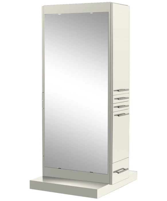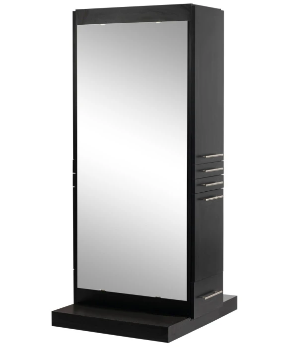 DescriptionThe Omni Double Styling Station w/ Mobile Base features clean, modern lines and is double-sided to support two stylists at the same time. This free-standing styling station comes complete with (2) 60" full-length mirrors and ships to you in two fully assembled pieces for easy installation. Each side of the Omni Double Sided Styling Station is identically equipped with an upper storage cabinet, two utility drawers, a slide-out tool panel to accommodate one blow dryer and two curling irons, as well as one lower drawer for additional storage! This dual sided styling station features hidden wheels on the bottom for easy cleaning & maneuverability throughout your salon. This feature would be a great asset to any cosmetology school looking to create an easy transformation from classroom to hands-on work space. The Omni Double Styling Station is available in your choice of 40 laminate colors to perfectly match your salons look and feel. And if you only have the need for (1) stylist at this station we offer the Omni Styling Station w/ Mobile Base.