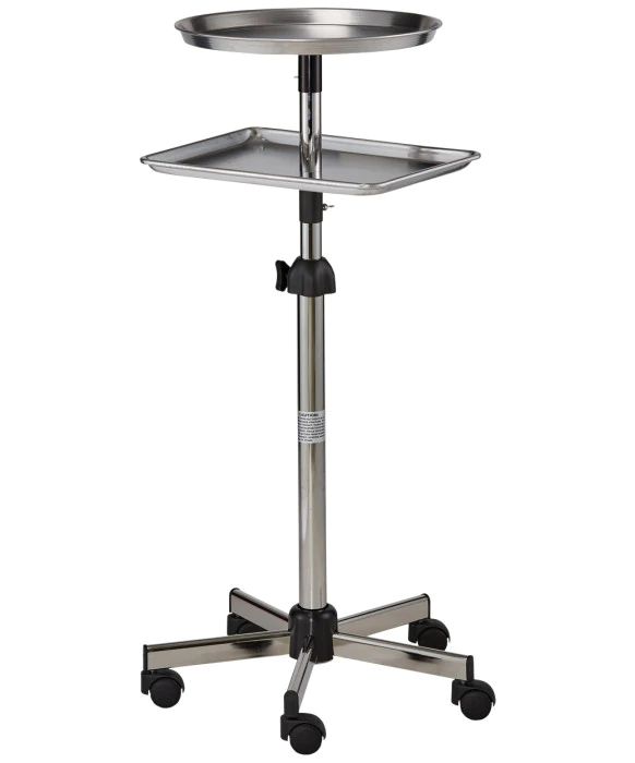DescriptionThe Pibbs ART68 Metal Mayo Utility Tray is fully height adjustable and the perfect size for a multi-use salon tray. This tray comes on wheels and can be easily moved from station to station throughout the salon. This unit has a 16.5" round metal utility tray that can be used for a wide variety of services including coloring, chemical services, or just to simply hold tools for easy access. In addition to the metal round tray on the top, this unit comes with an additional rectangular tray directly underneath that can be used for storing waste material, additional products, or tools for servicing. The base of the unit has a sturdy five star chrome support and metal frame that serves as the foundation of this durable unit.