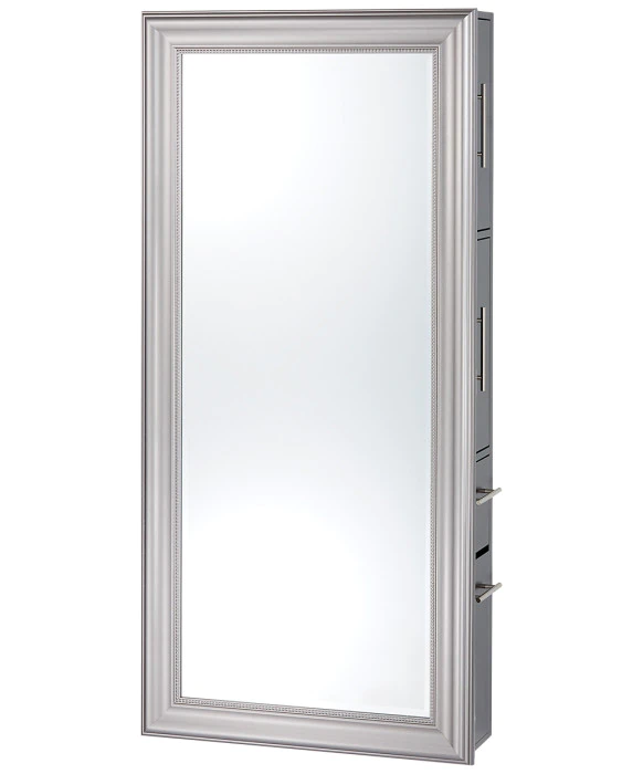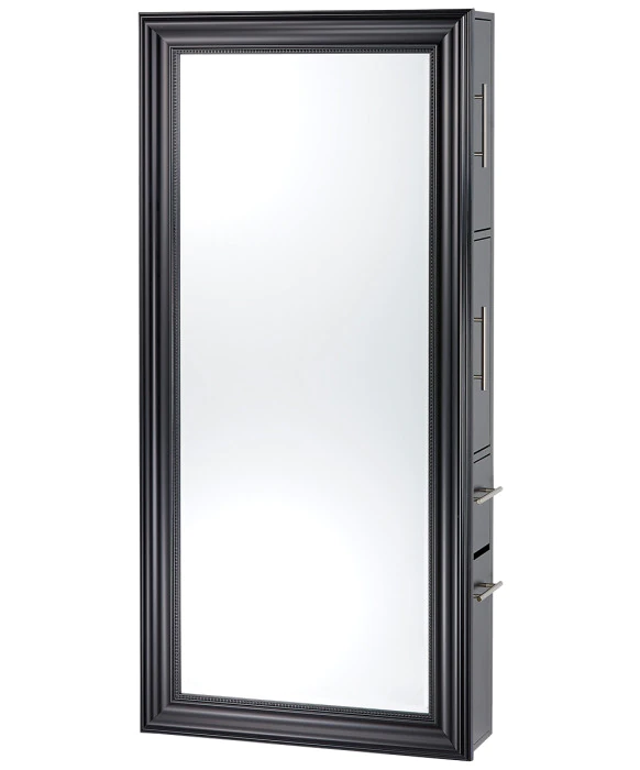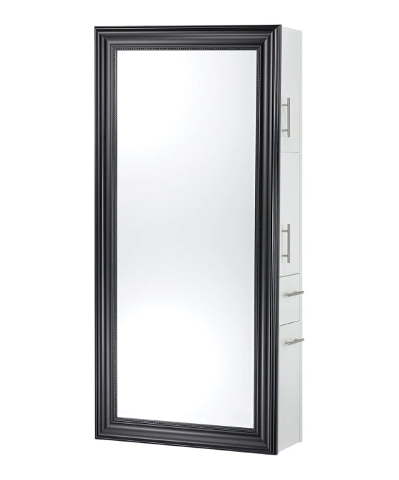DescriptionThe Pibbs Classic Salon Mirror & Storage Server is an elegant floating styling station that brings a classic, clean look to any salon. Available with a silver or black frame, the extra-large, full-length mirror is framed by a refined, yet ornate design with curved edges and a dotted accent. The server is available in black or white, and features 1 pull out tool panel with tool holders – 1 with wire access to keep the drawer closed while using your tools, 1 utility drawer, 2 spacious storage cabinets on the right side, 2 large storage cabinets on the left side, and durable metal bar pulls. Keep your salon station looking clean with the extensive storage and small footprint of the refined, luxurious Pibbs Classic Salon Mirror & Storage Server We also offer the Pibbs Class Salon Mirror for design continuity across your salon.
