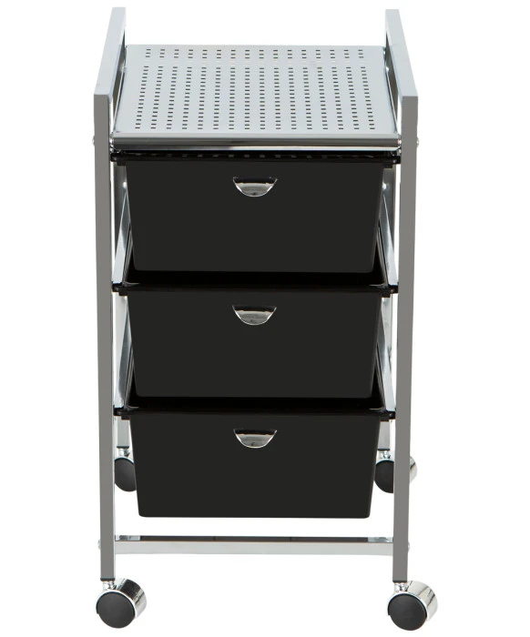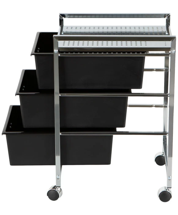 DescriptionThe D23 3 Drawer Metal Roller Cart by Pibbs is Made in the USA. This is a Professional Salon or Spa Utility Cart on Wheels that has a very sturdy metal frame and is perfect for use with any Pedicure Chair. This cart has 3 extra large drawers on the inside that can be used for storage and they are completely removable. This cart also has a heavy duty metal top that can be used as a work surface even for your hot utilities. This roller cart has a stylish European look and is very versatile for use with any Pedi Chair.