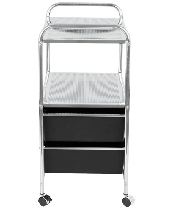 DescriptionThe D4 Metal Work Cart by Pibbs is unique in that it is perfect for use in both the salon and spa. This cart is available with either black or white drawers. This is a Professional work cart on wheels that has a very sturdy metal frame. It features 4 extra large drawers on the inside that can be used for storage and they are completely removable. This cart also has a heavy duty metal top that can be used as a work surface even for your hot utilities.