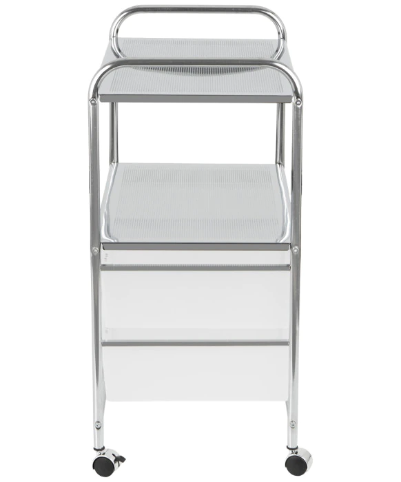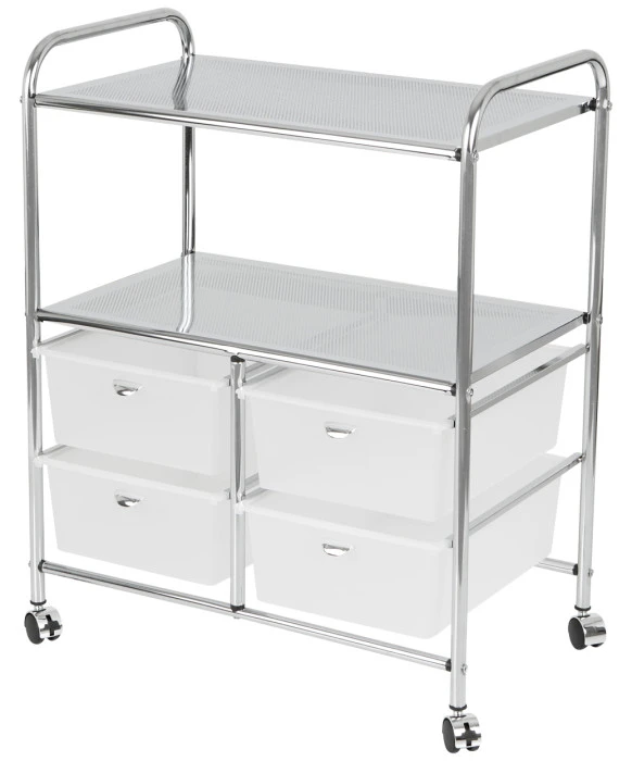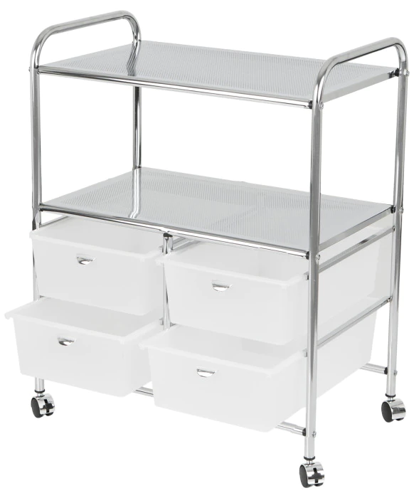 DescriptionThe D4 Metal Work Cart by Pibbs is unique in that it is perfect for use in both the salon and spa. This cart is available with either black or white drawers. This is a Professional work cart on wheels that has a very sturdy metal frame. It features 4 extra large drawers on the inside that can be used for storage and they are completely removable. This cart also has a heavy duty metal top that can be used as a work surface even for your hot utilities.