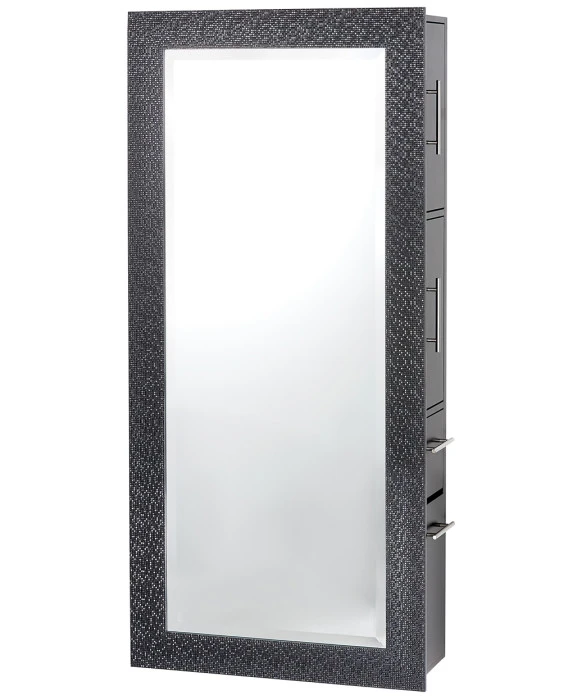 DescriptionThe Pibbs Diamond Salon Mirror & Storage Server is a beautiful floating styling station that adds a unique, clean look to any salon or spa. This salon mirror station features a chic sparkling mirror frame that is available in gold, silver, black, or white, and the spacious server is available in black or white. The Pibbs Diamond Salon Mirror & Storage Server also features durable metal bar pulls, an extra-large full-length mirror, one tool holder with wire access to keep the drawer closed while using your tools, 1 utility drawer, 2 spacious storage cabinets on the right side, and 2 large storage cabinets on the left side. The Pibbs Diamond Salon Mirror & Storage Server has a small footprint with plenty of space for products and storage, and is a beautiful addition to any upscale salon or spa. We also offer the Pibbs Diamond Salon Mirror for design continuity.