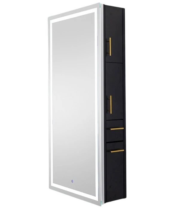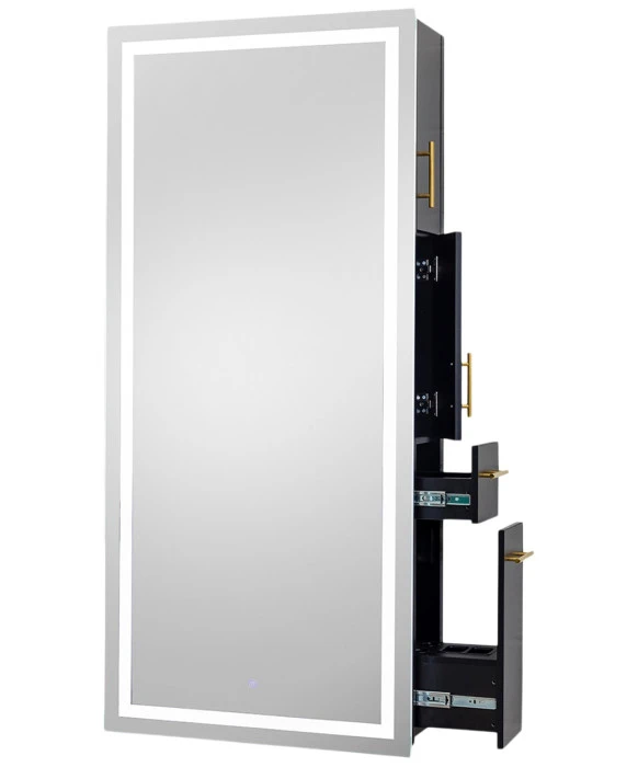 DescriptionThe Pibbs 9110 Lumina Gold Handle LED Salon Mirror & Storage Server add a clean & modern touch to any salon, spa or barbershop. The extra-large, full-length mirror features a built-in dimmable LED light with an easy and accessible on/off button, that will bring a refined glamour to your styling station. The wood server is available in 5 vibrant color options and features beautifully finished gold metal bar pulls, 1 tool holders with wire access to keep the drawer closed while using your tools, 1 utility drawer, 2 spacious storage cabinets on the right side, and 2 large storage cabinets on the left side. The beautiful Pibbs Lumina LED Salon Mirror & Storage Server has a small footprint with plenty of space for products and storage, and brings an opulent elevation to any upscale salon or spa. And if you need an additional mirror to match this luxe server we offer the Pibbs Lumina LED Salon Mirror. *Please allow 2 - 4 weeks for shipment of server colors other than black.