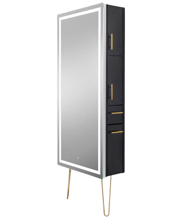 DescriptionThe Pibbs Lumina LED Salon Mirror & Storage Server w/ Legs add a clean & modern touch to any salon, spa or barbershop. The extra-large, full-length mirror features a built-in dimmable LED light with an easy and accessible on/off button, that will bring a refined glamour to your styling station. The wood server is available in 5 colors and features beautifully finished metal bar pulls & lower support legs, 1 tool holders with wire access to keep the drawer closed while using your tools, 1 utility drawer, 2 spacious storage cabinets on the right side, and 2 large storage cabinets on the left side. The beautiful Pibbs Lumina LED Salon Mirror & Storage Server has a small footprint with plenty of space for products and storage, and brings an opulent elevation to any upscale salon or spa. And if you need an additional mirror to match this luxurious server we offer the Pibbs Lumina LED Salon Mirror. *Please allow 2 - 4 weeks for shipment of server colors other than black.