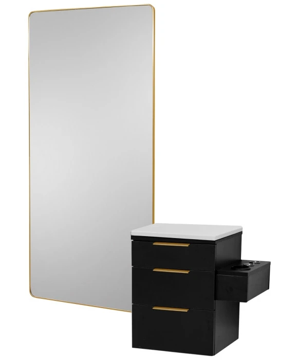 DescriptionThe Pibbs PB6004 Milano Styling Station with Mirror is a complete styling station package that includes a durable “workhorse” styling station along with a modern, full-length salon mirror. This styling station is compact and efficient and can be easily customized to match your salon or spa’s décor. The Milano Station is available in 4 wood colors, 3 stone top colors and 3 handle colors, all of which are interchangeable to create the perfect combination just for you. This Styling Station also features a beautiful stone top, 3 spacious storage drawers and a side tool arm built to accommodate 1 blow dryer and 2 curling irons. For your convenience and a hassle-free set up, this station ships fully assembled and all you need to do is attach the side tool arm and you are ready to go! The Viola full-length salon mirror is also available in 4 color options and features a rectangle glass mirror with rounded edges and a light yet durable aluminum frame.